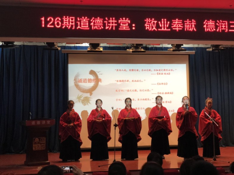 “其為人也,發(fā)憤忘食,樂(lè)以忘憂,不知老之將至云爾”,“臣鞠躬盡瘁,死而后已”學(xué)生代表朗誦的道德經(jīng)典也再次說(shuō)明愛(ài)崗敬業(yè)精神從古至今一直為人們所崇尚。
