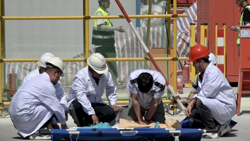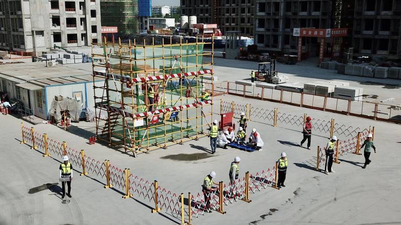 隨后,柳林路項目部開展火災(zāi),高處墜落應(yīng)急救援演練,本次演練模擬了施工區(qū)域突發(fā)火情,慌亂中導(dǎo)致工人雷某腳下失穩(wěn),從無防護缺口墜落。事故發(fā)生后,率先發(fā)現(xiàn)險情的工作人員立即示警并上報,現(xiàn)場立刻啟動應(yīng)急預(yù)案,在出動各應(yīng)急小組實施救援的同時,緊急聯(lián)絡(luò)消防、公安、醫(yī)療單位,迅速、有序合力完成險情處置。